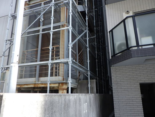 親しいサイン&ディスプレイ社からの二次請けですが、2025年の8月から9月にかけて行いました「オフィスビルの非常階段鉄部塗装」です。足場架設から請け、ケレン、総錆止め、2液ウレタン塗装で、事故もなく無事に完了承認を得ました。