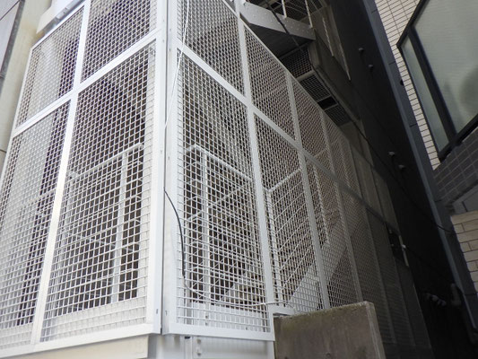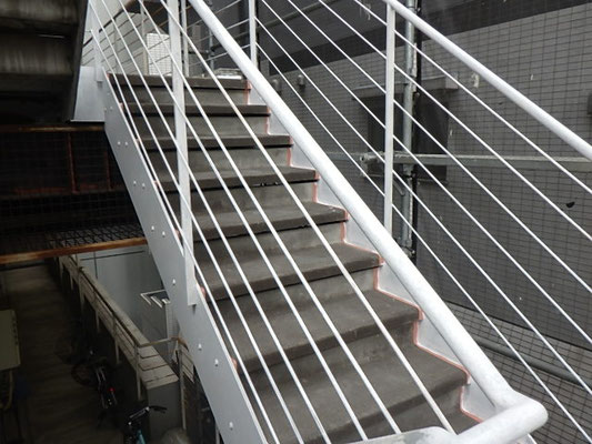 これは2022年6月から7月にかけて行いました中目黒2丁目の「8階建て外階段修繕・塗装」です。既存防水部分の削り落としをしてからテナント様からの「臭い」に応えて塗料メーカーとの相談による「ここへの適正で耐久性のある水性床塗料」塗装と、歩行者の多い下方は「長尺シート」に貼り替え、手摺り等の鉄部は2液性のウレタン塗装を行いました。位置的に鳩の糞が多いので、施主様の依頼で階段とベランダ全体をメッシュで囲いなおす協力もいたしました。